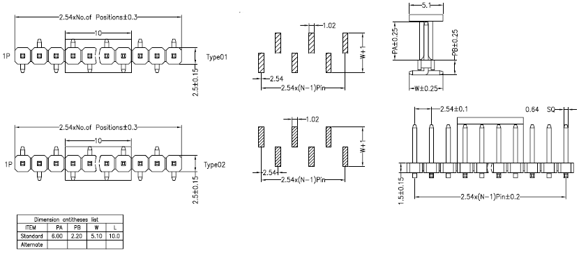 2.54mm Pin Header Single Row - H:1.5 DIP Type Dual plastic - No.Y02102-21S-DIP-XP
